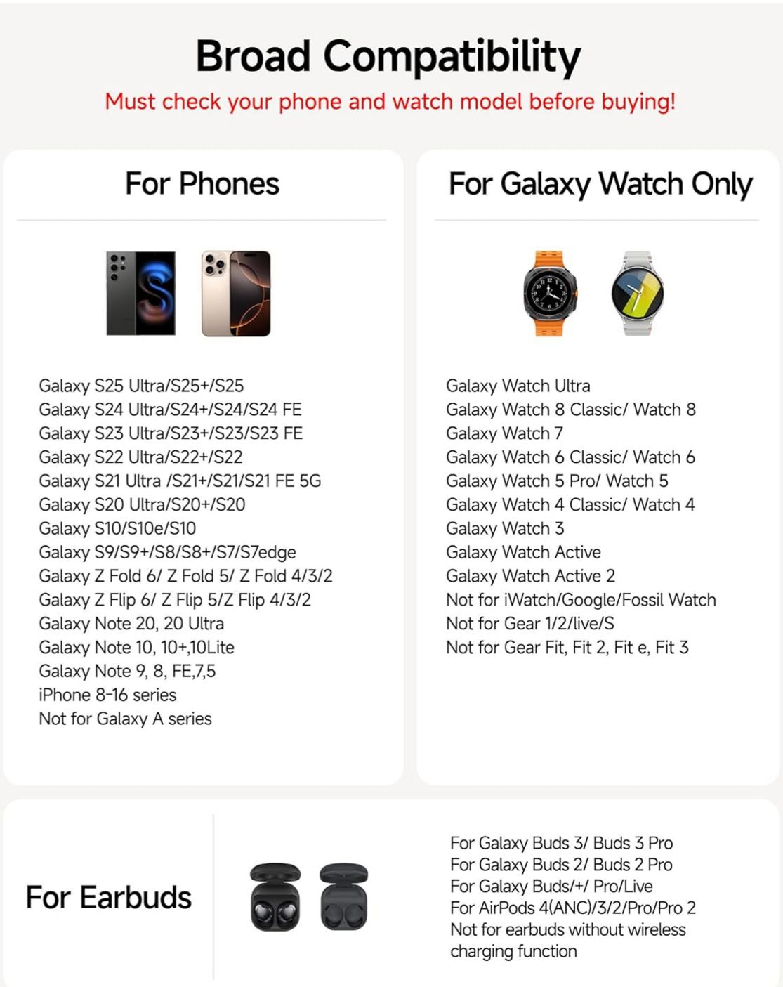 All-in-One Design – Charge your phone, Galaxy Watch (Ultra/8/7/6), and Galaxy Buds (3/Pro) simultaneously.